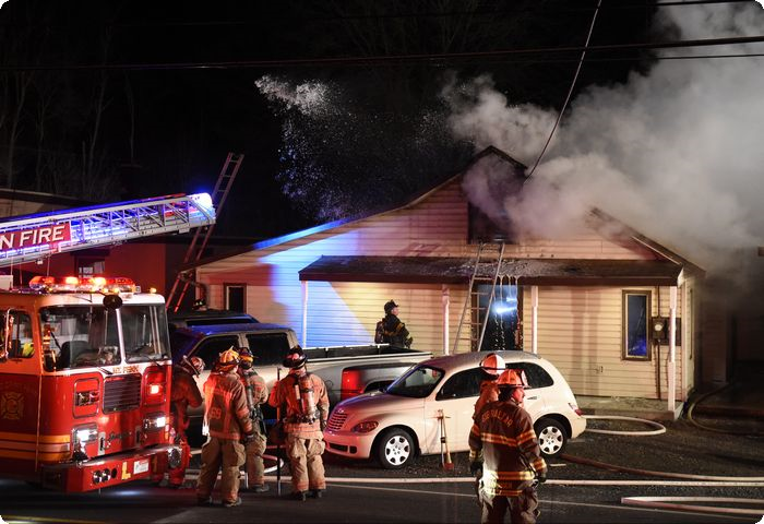 On January 19 shortly before 11p.m. Ladder 1 was dispatched to 3178 Morgantown Rd. (Route 10) in Robeson Township to assist Company 23 (Gibralter) and 24 (Geigertown) for a reported structure fire. On arrival crews from the responding companies found a well involved home on the property of Route 10 Auto Sales. The ladder crew split up in order to ladder the building and perform a search. Several ventilation holes were placed in the roof in order to improve conditions for crews making an attack on the fire. Soon after the last opening was made, fire began venting from those openings as well as the front of the second floor and roof operations had to be terminated. As the fire was brought under control crews from the responding companies remained on the scene for several hours in order to assist with overhaul of the structure and ensure the fire was completely extinguished. In addition to the fire, crews had to contend with cold and windy conditions as well as ice caused by water runoff. The fire remains under investigation by the PA State Police Fire Marshal.